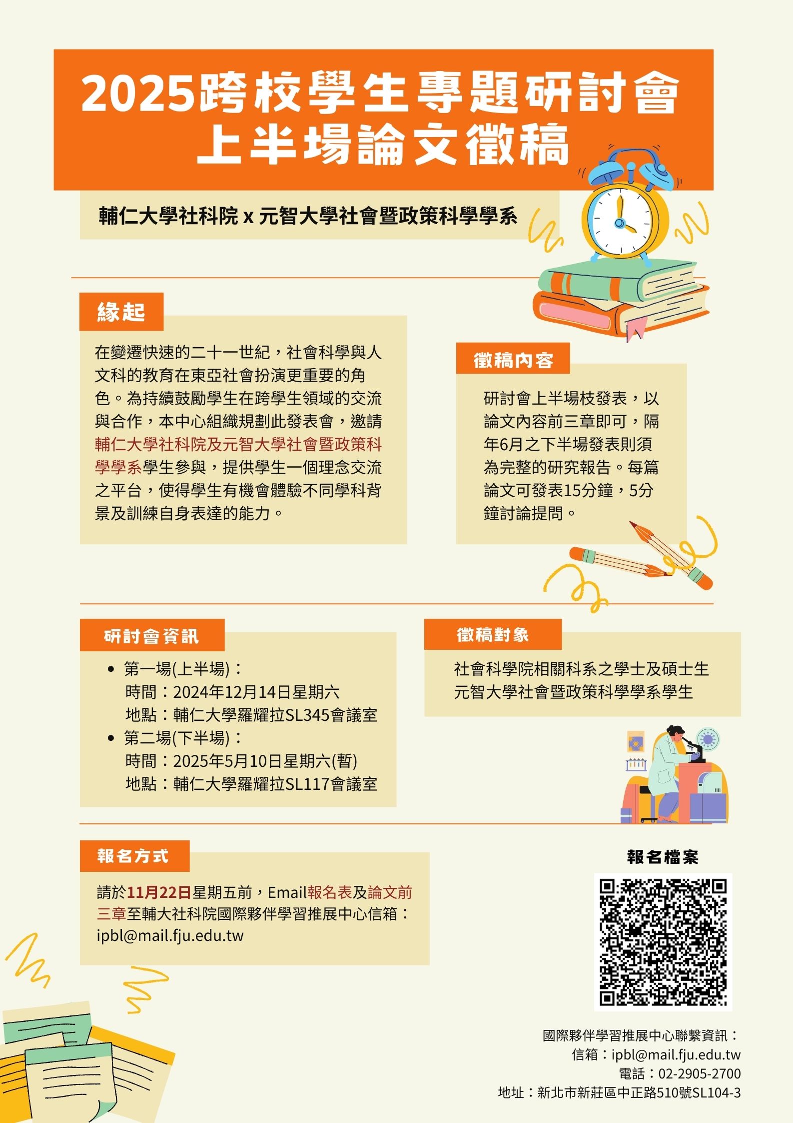 🚩注意:本次為研討會上半場報名,僅需繳交論文及專題前三章即可,下半場於隔年5月或6月舉行,可隨時關注本中心訊息發布。上下兩場參與完成會核發研討證明,若僅參與上半場或下半場則無,但仍可投稿並參與。